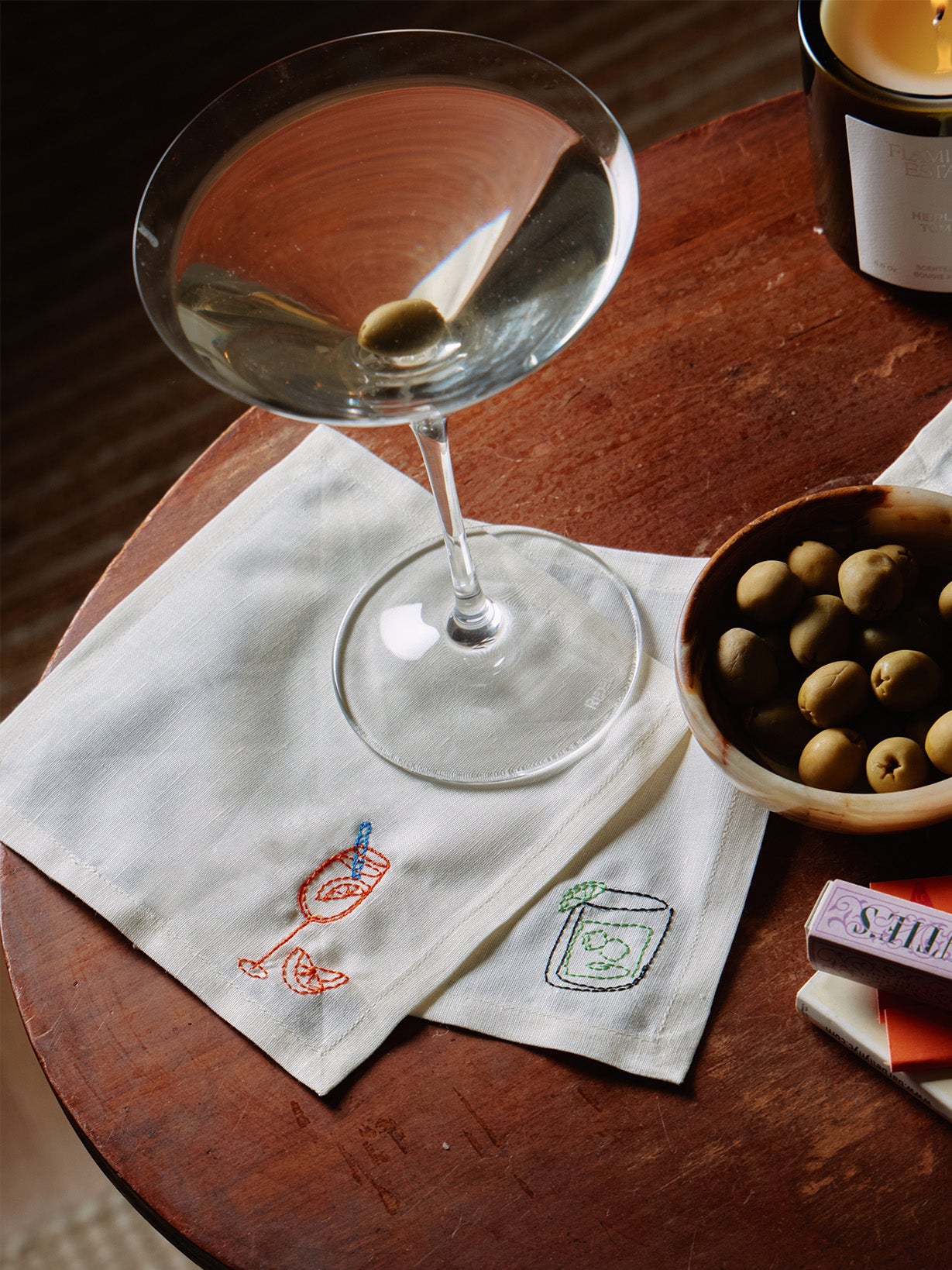 Spice up cocktail hour with napkins embroidered with our signature cocktails including the Martini, Margarita, Spritz, and Wine Glass.
